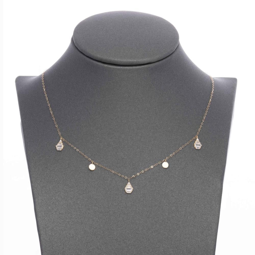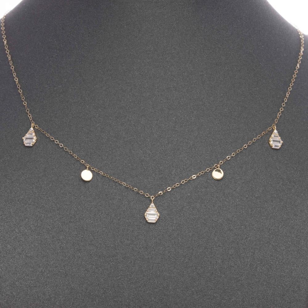هو شوكر ناعم مصنوع من ذهب عيار 18 قيراط بتصميم مميز، مزين بتعليقات دائرية صغيرة وتعليقات مرصعة بالزركون بتصميم ألماس.