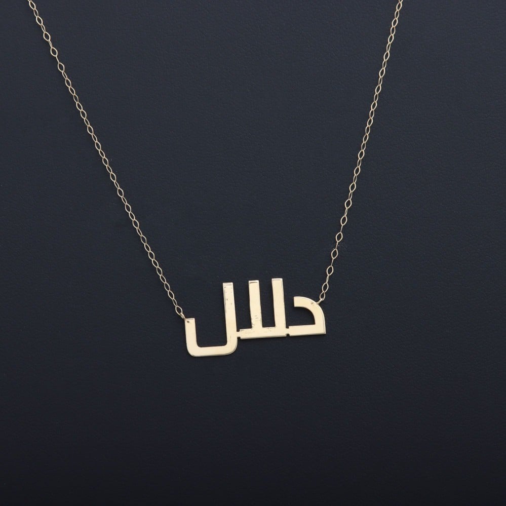 سلسال وقلادة ذهب بتصميم اسم مكتوب بأحرف عربية، صمم خصيصاً لحفظ الذكريات الجميلة بين الأحباب.